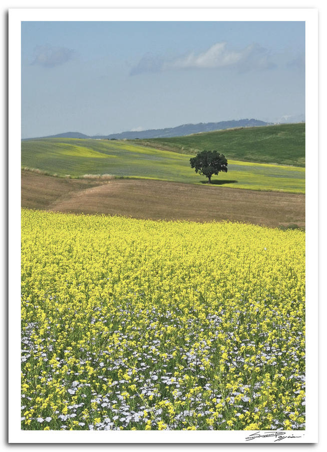 Quiete viva Strati di colore diventano orizzonti. Nell’effimero del giallo e nella permanenza del colle, la solitudine della pianta distilla un’immobilità vibrante. |
